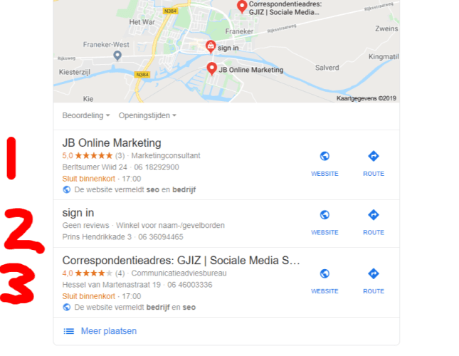 Het extra voordeel wat je met deze Google reviews haalt kan een flink verschil in verkeer naar je site betekenen en dus ook offerte aanvragen of product verkopen. Degene met de meeste beoordelingen en de hoogste review score wordt namelijk in het Google Maps kaartje getoond. Die staat nog boven de eerste zoekresultaten. De kans is dus erg groot dat men hierop klikt. Als je dus bij de eerste 3 weet te komen heb je een mooie voorsprong op de andere bedrijven in jouw omgeving.